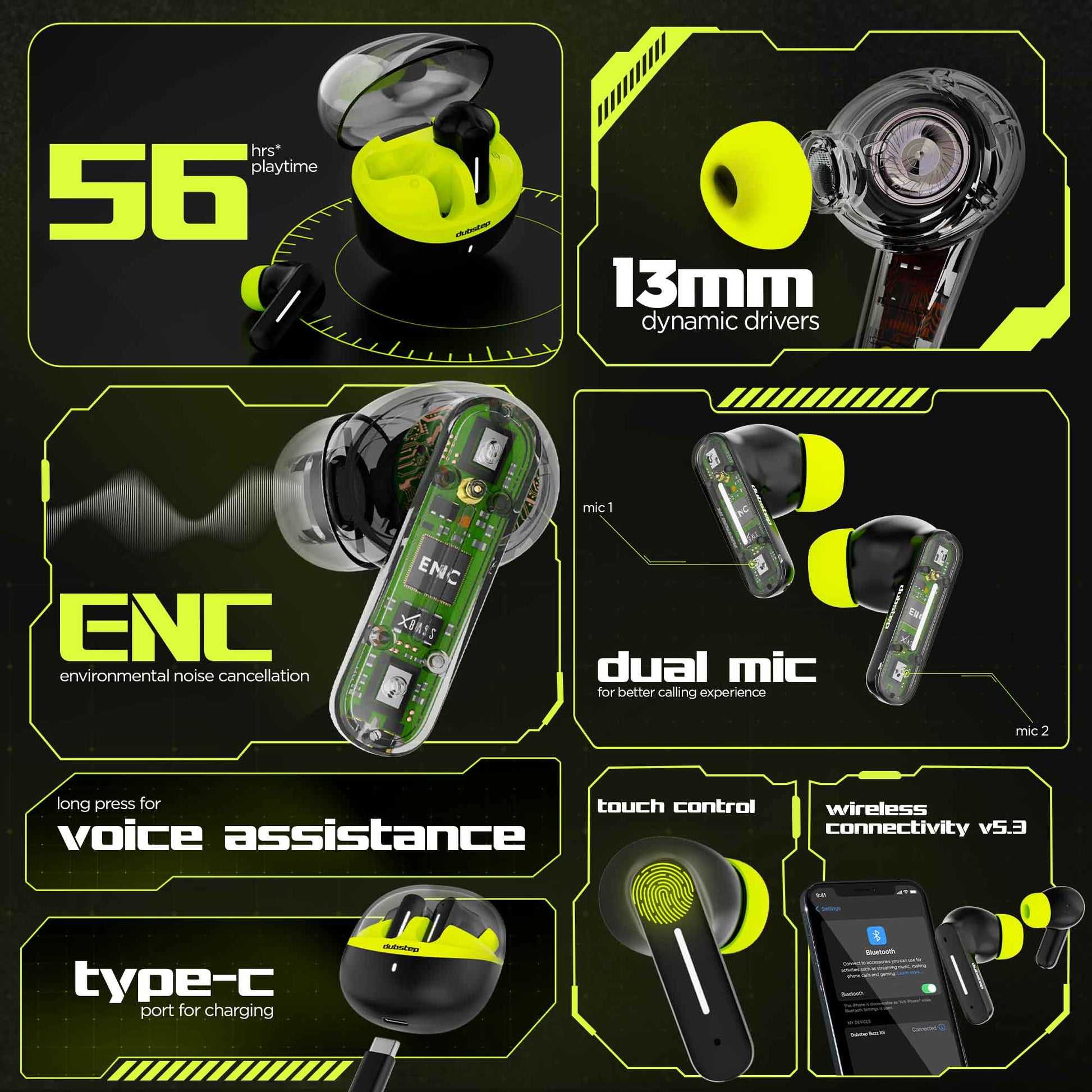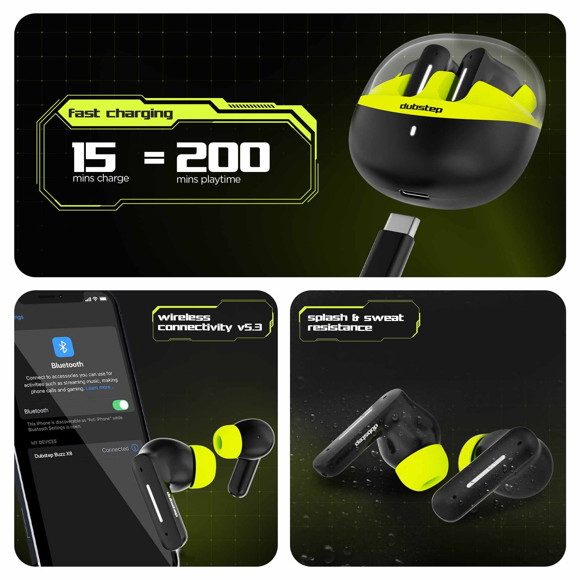 Dubstep Buzz X8 True Wireless Earbuds deliver epic sound wrapped in bold style. Powered by 13mm dynamic drivers with X-Bass® technology, every beat hits harder, every note feels bigger. Stay connected with dual-mic ENC for crystal-clear calls, and take control with intuitive touch controls plus voice assistance at your command. With a massive 56hrs of playtime, you’re set for music marathons, work calls, and everything in between. Buzz X8 isn’t just about listening—it’s about owning your vibe, loud and clear.