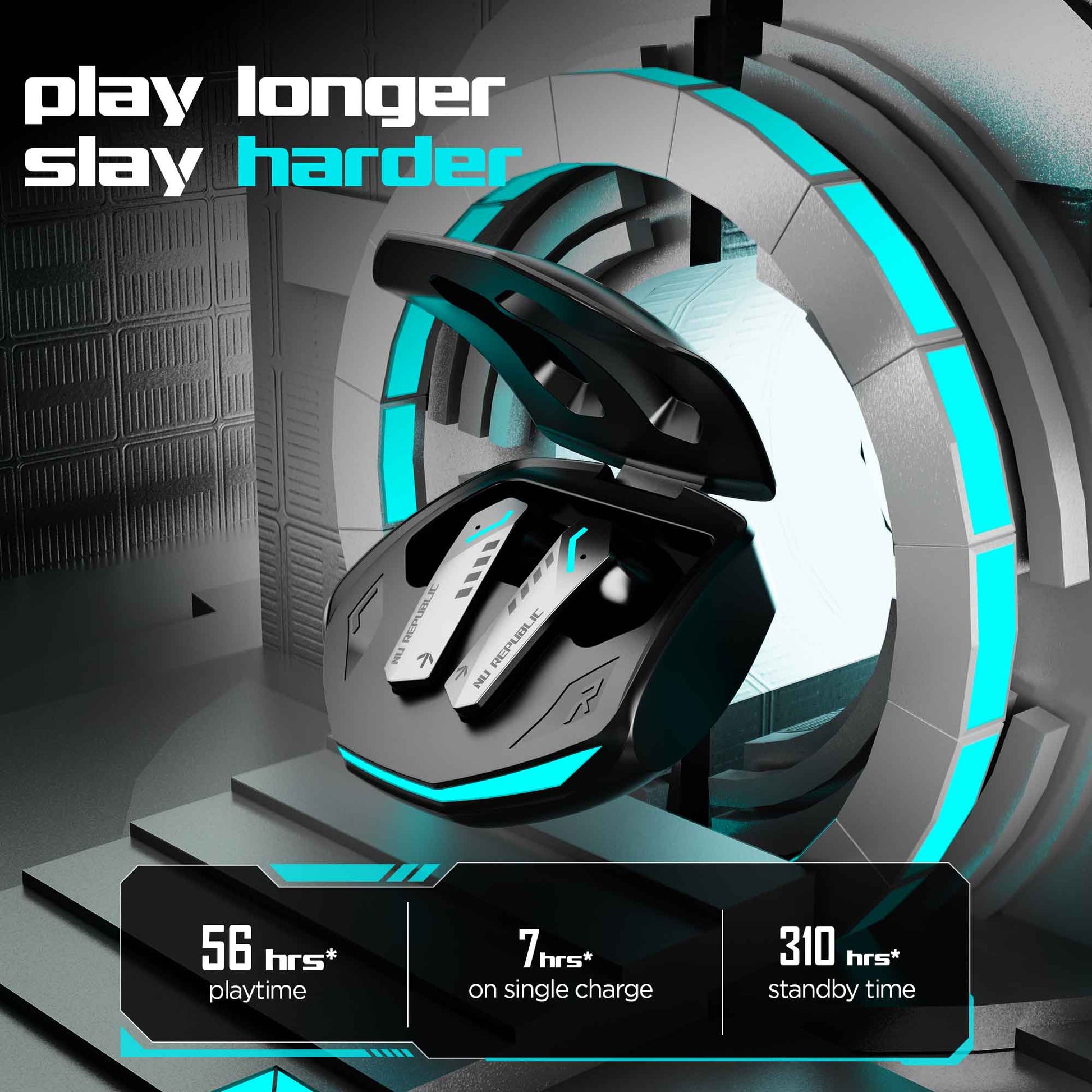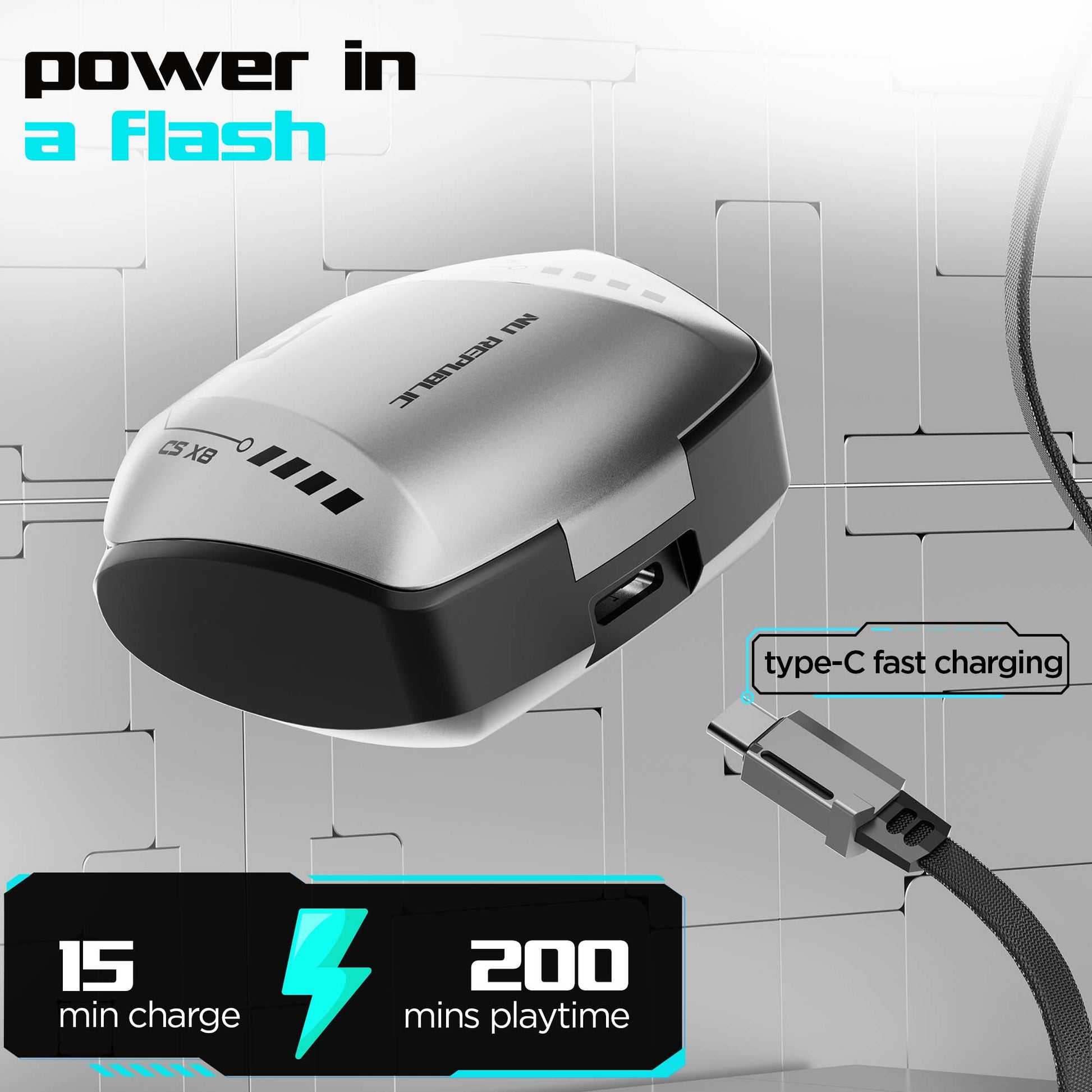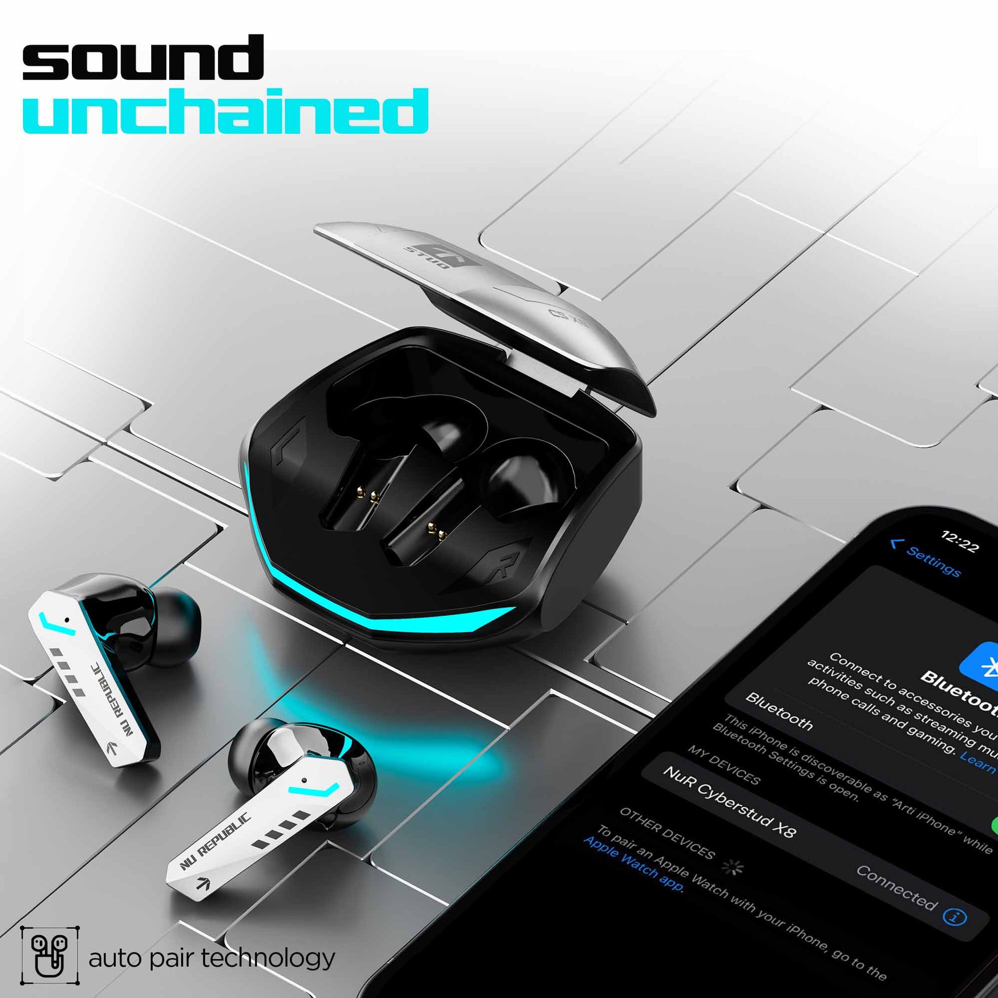 The Nu Republic's Cyberstud X8 True Wireless Earbuds offer cutting-edge features for an unmatched audio experience. Enjoy environmental noise cancellation ENC, ultra-low 40ms latency, an impressive 56 hours* of playtime, and quad mics for crystal-clear calls. Powered by 13mm neodymium drivers with X-Bass® technology, the Cyberstud X8 is the ultimate companion for both music lovers and gamers.