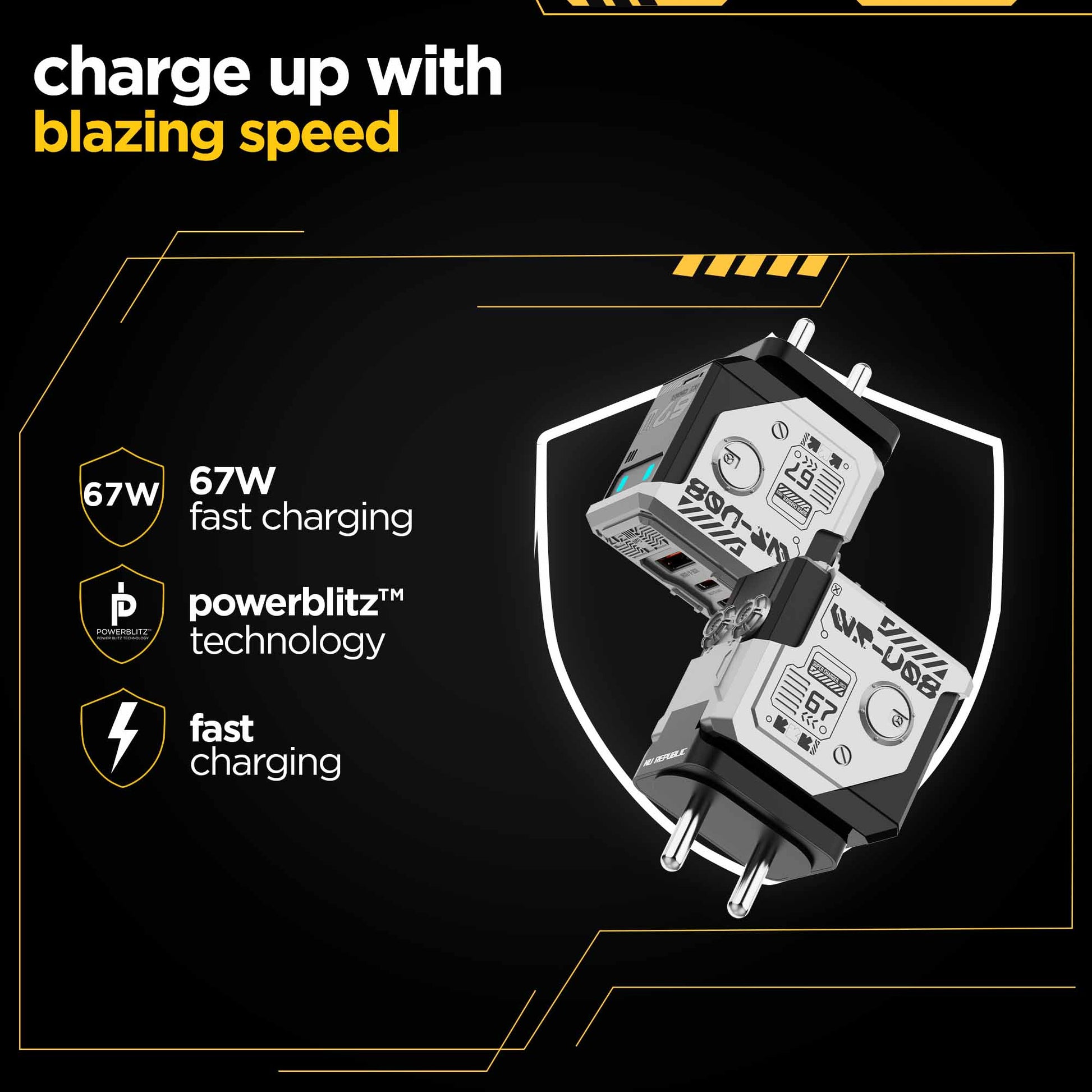 67W fast charger is powered by cutting-edge Powerblitz™ technology to deliver fast charging, stable current speeds, and overheat protection.