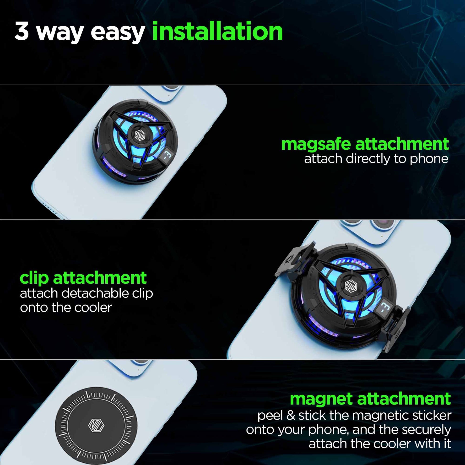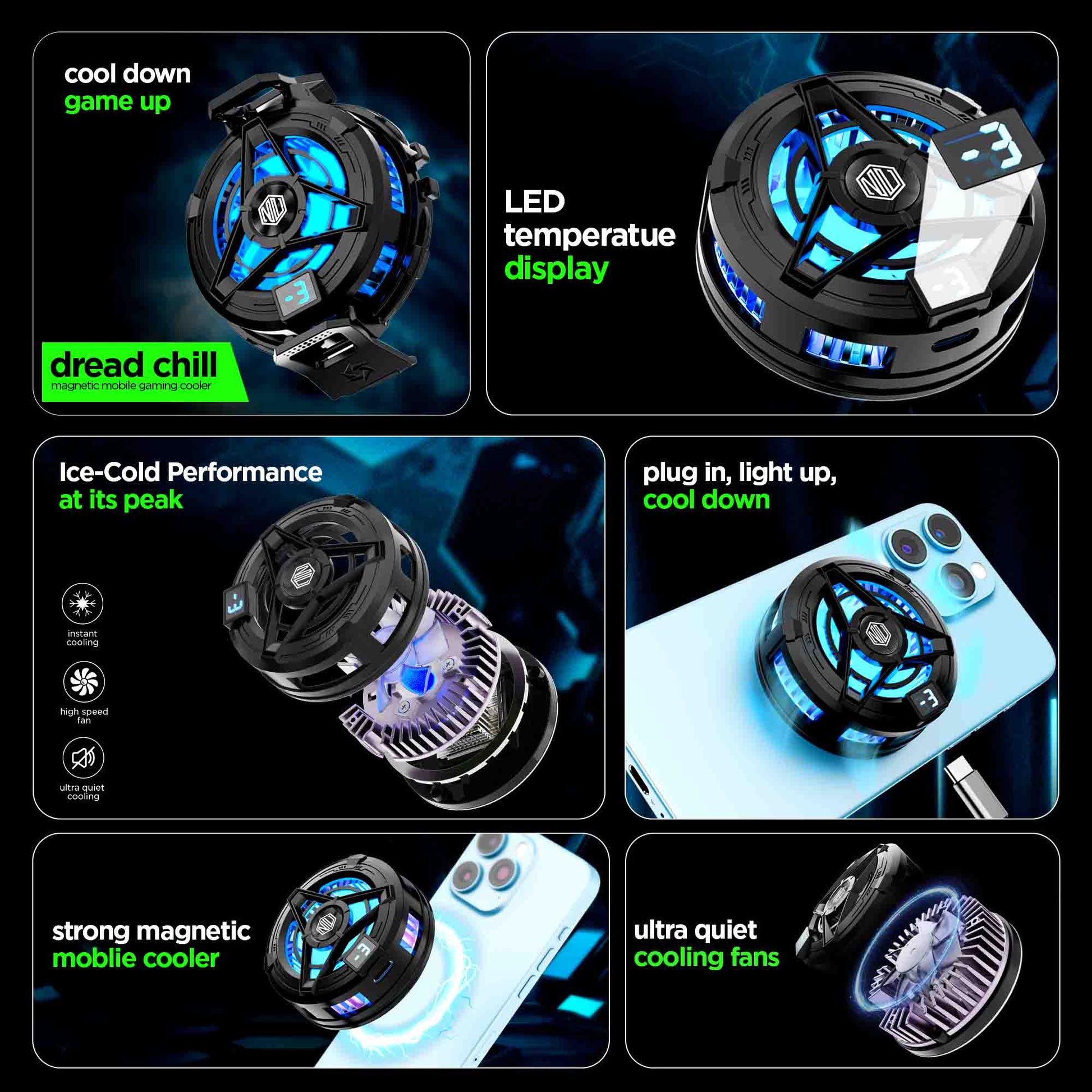 level up your gaming with the Nu Republic dread chill magnetic mobile gaming cooler. experience instant cooling with a high-speed fan that kicks in when the heat is on. monitor your device's temperature with the sleek display, all while enjoying silent operation that keeps you fully immersed in the action. stay cool, play hard, and own the game without breaking a sweat.