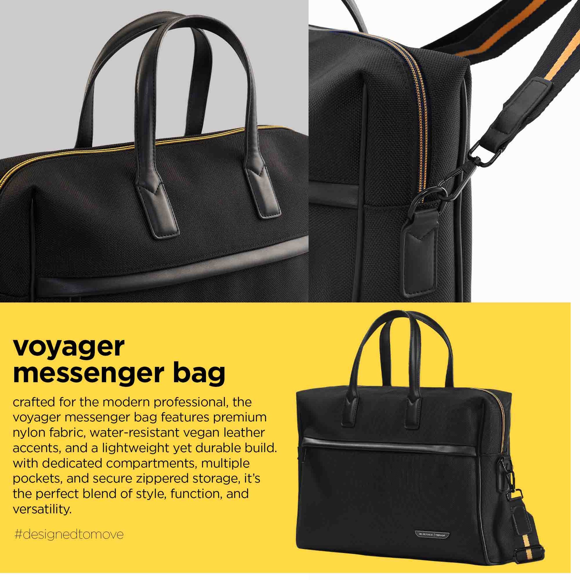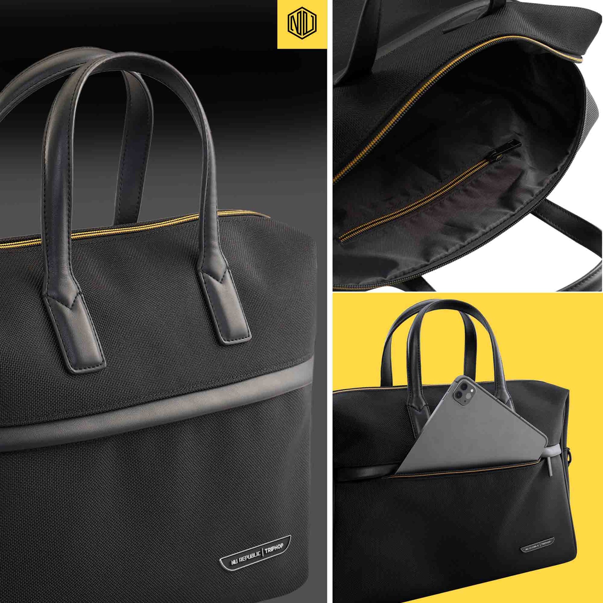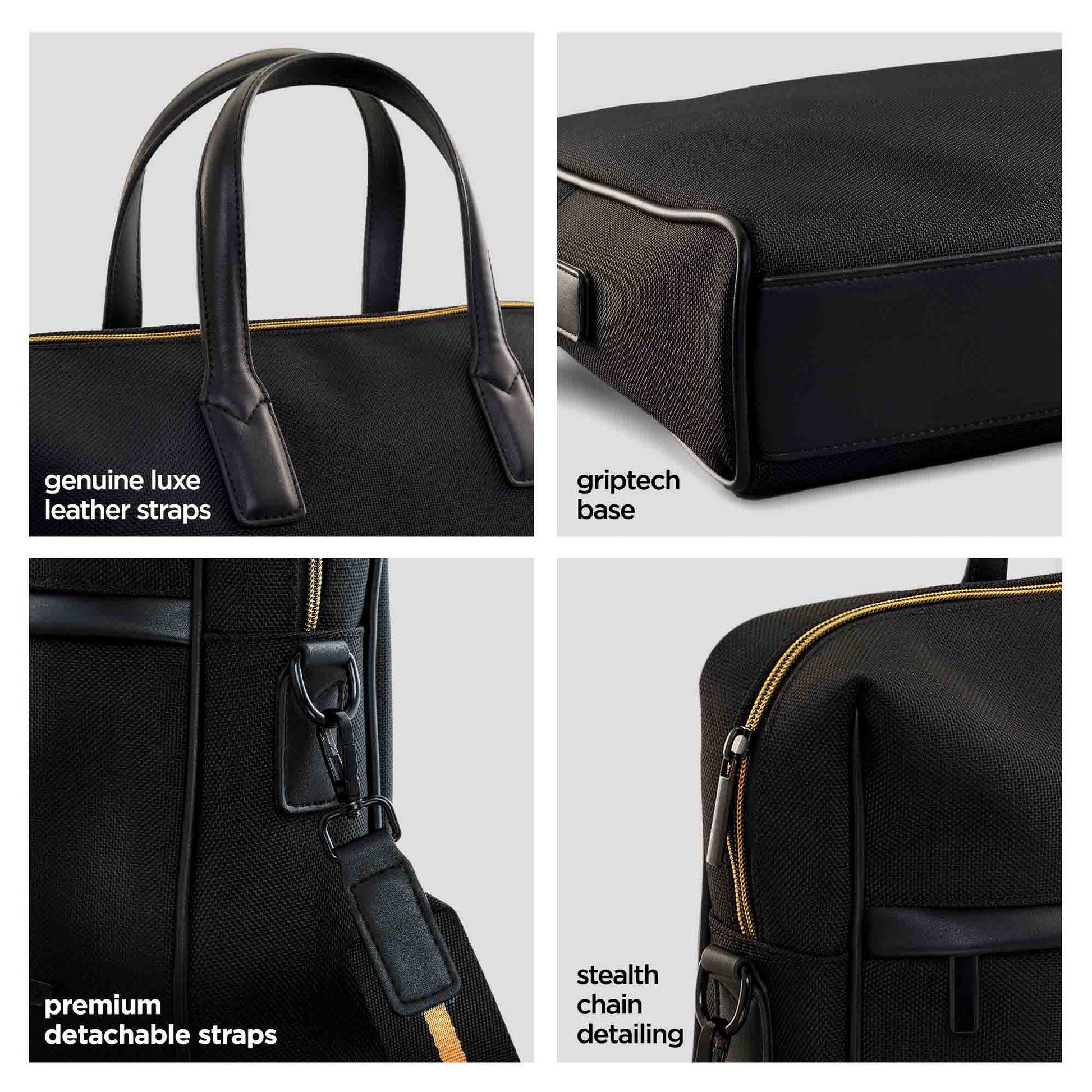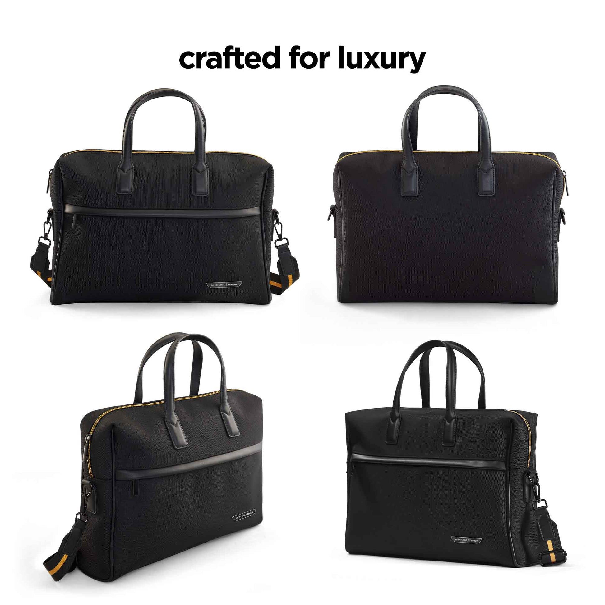Crafted with water resistant Vegan Leather and Premium Nylon fabric, laptop and tablet compartments, numerous interior and exterior pockets and a removable shoulder strap, zippered pockets, Lightweight build, Timeless Design, Splash-dust & Scratch Resistant, Luxury Embossed Logo.